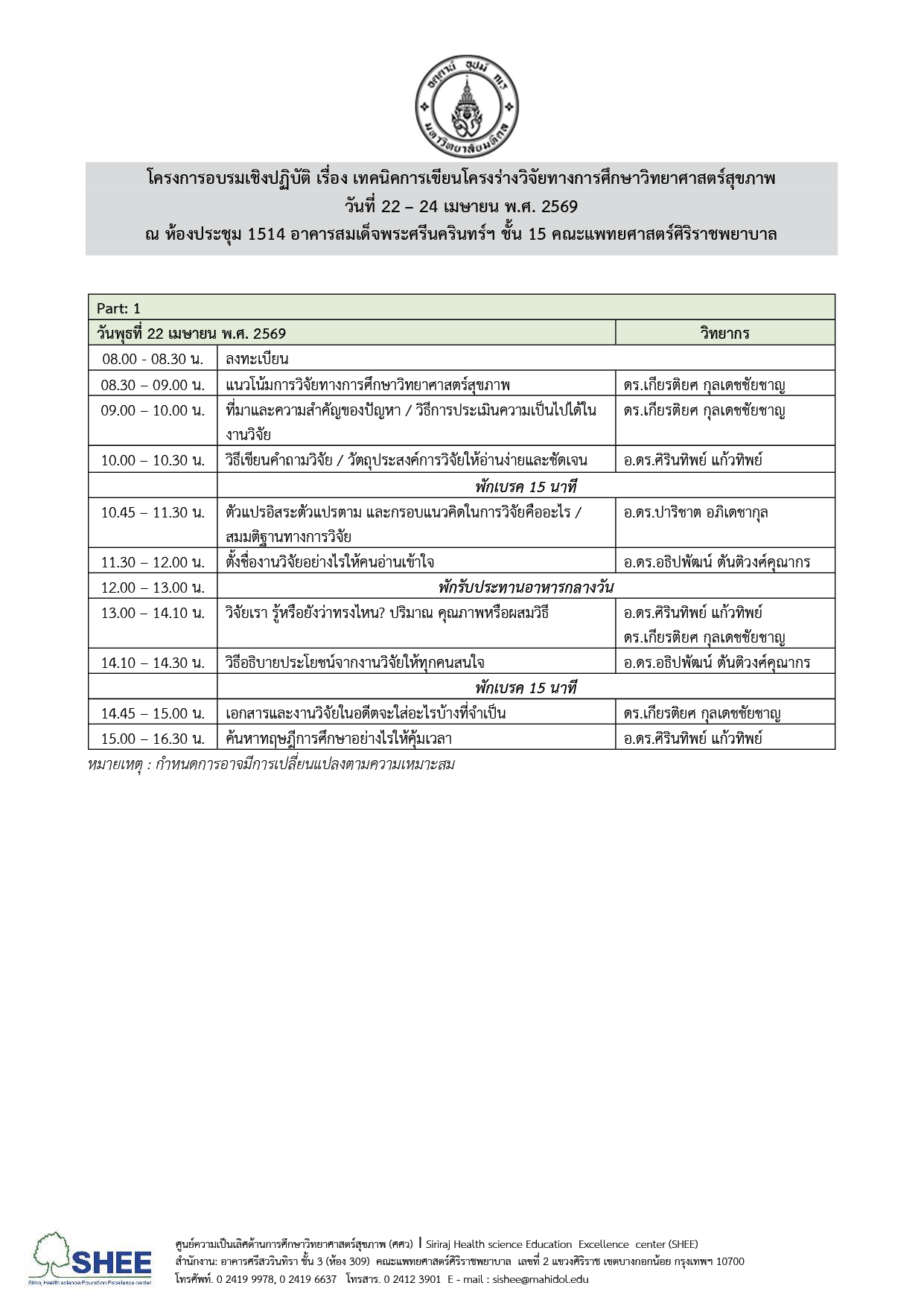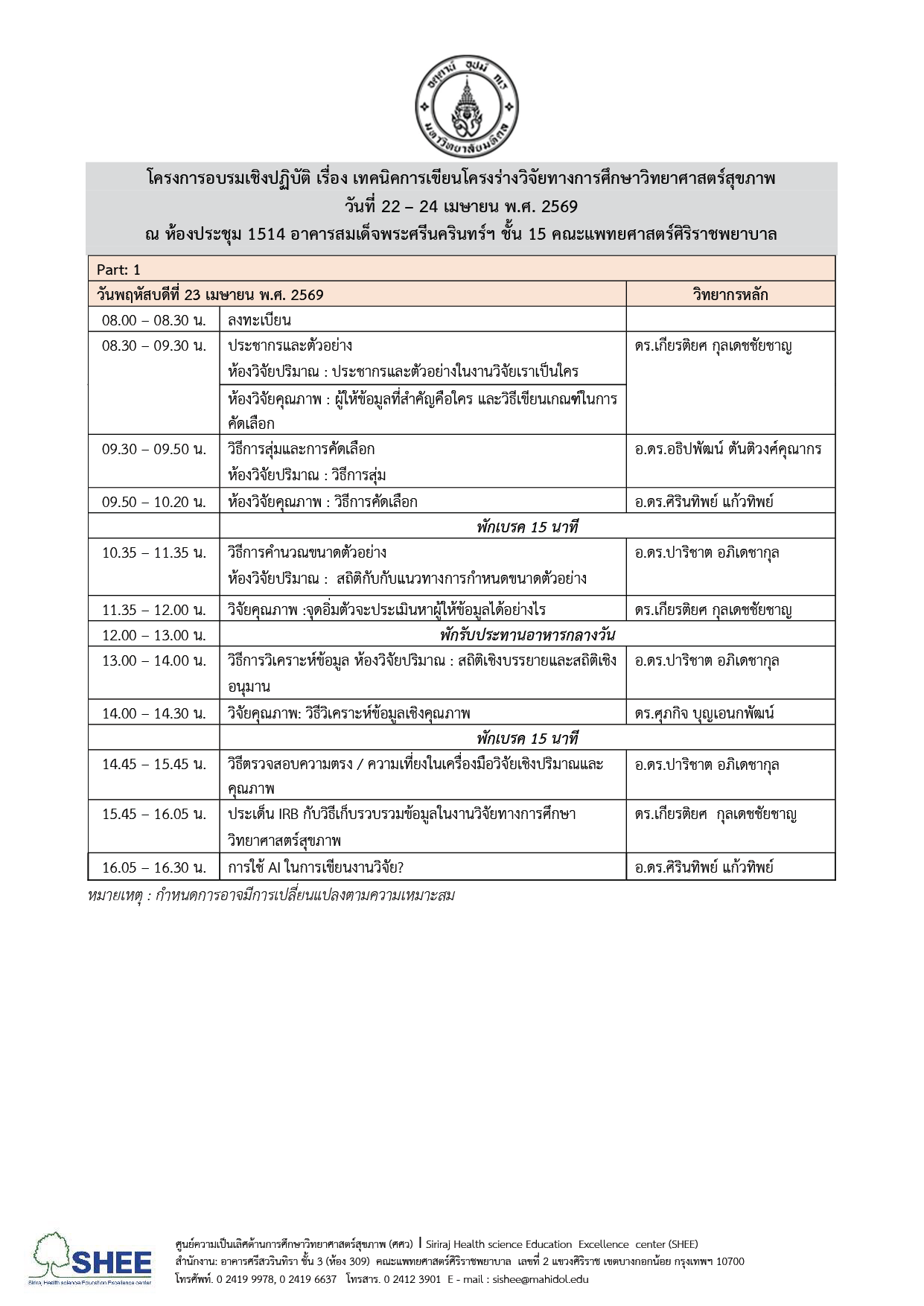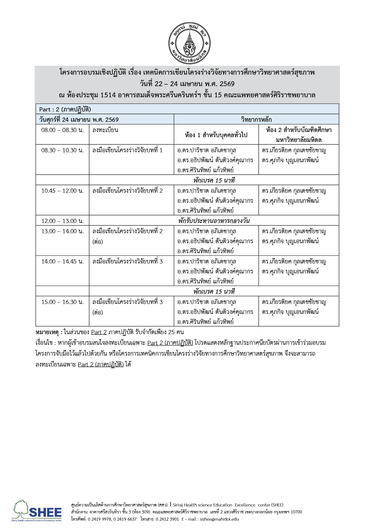 - อบรม Part 1 และ Part 2 วันที่ 22 – 24 เมษายน พ.ศ. 2569 ณ ห้องประชุม 1514 อาคารสมเด็จพระศรีนครินทร์ฯ ชั้น 15 คณะแพทยศาสตร์ศิริราชพยาบาล