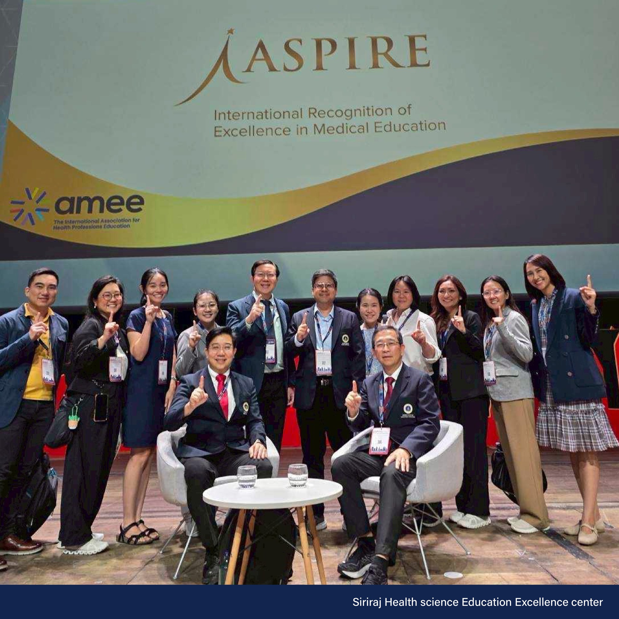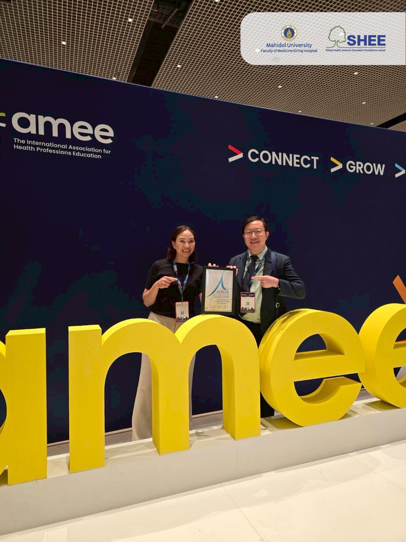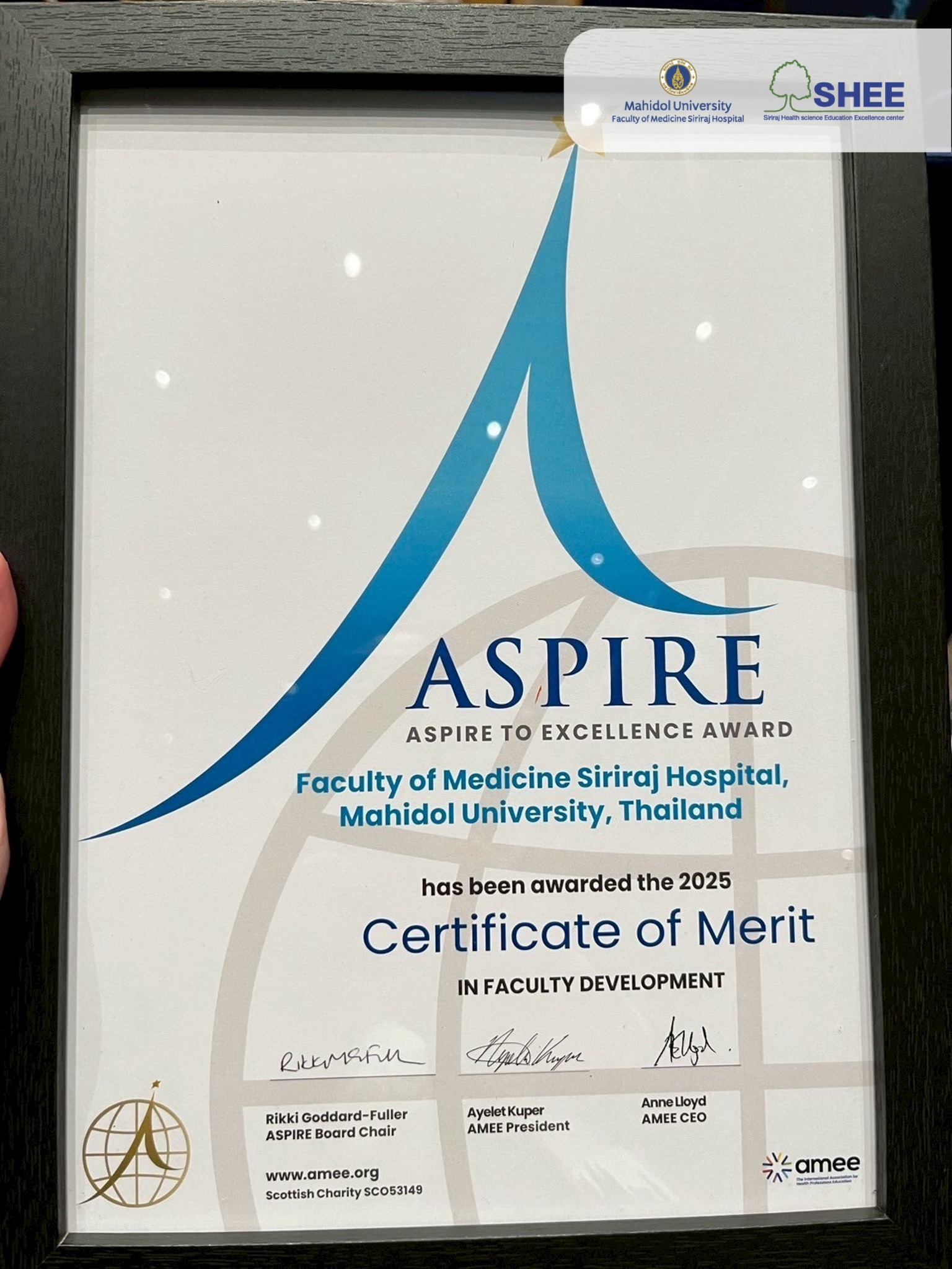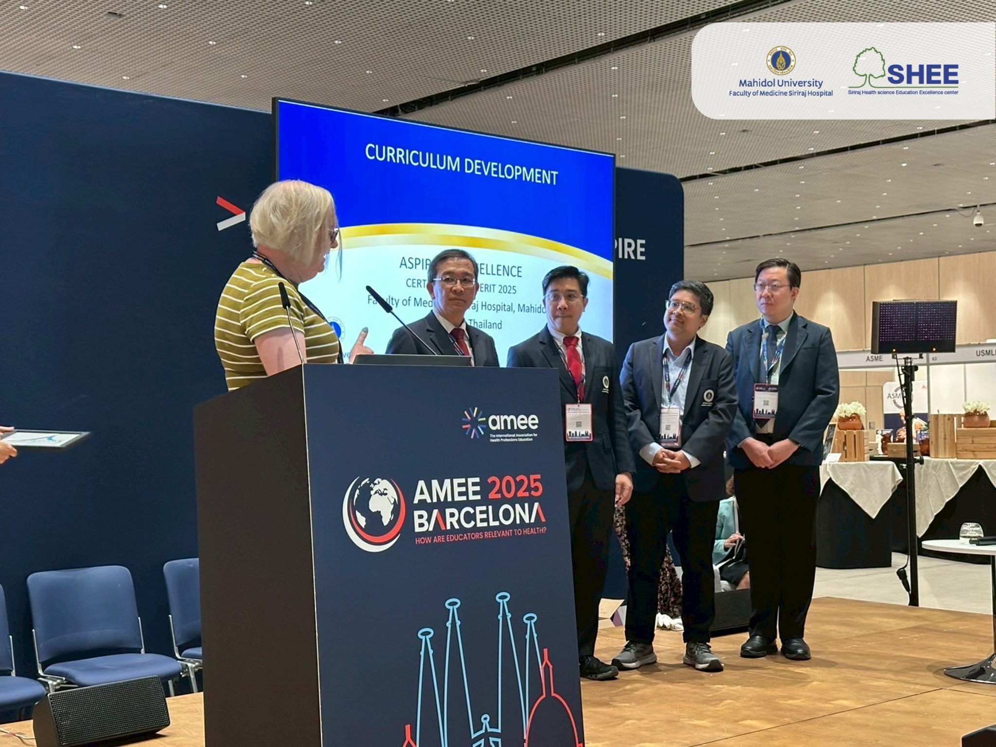 ในเดือนสิงหาคม 2568 รศ. ดร. นพ.เชิดศักดิ์ ไอรมณีรัตน์ ผู้อำนวยการศูนย์ความเป็นเลิศด้านการศึกษาวิทยาศาสตร์สุขภาพ คณะแพทยศาสตร์ศิริราชพยาบาล เป็นตัวแทนศูนย์ SHEE เข้ารับรางวัล Certificate of Merit in Faculty Development จากสมาคมการศึกษาแพทย์แห่งยุโรป (Association for Medical Education in Europe: AMEE) ในงาน AMEE 2025 Barcelona ณ เมืองบาร์เซโลน่า ประเทศสเปน รางวัลนี้ถือเป็นรางวัลอันทรงเกียรติที่สะท้อนถึงความมุ่งมั่นและความต่อเนื่องในการพัฒนาคณาจารย์และบุคลากรด้านการศึกษา
