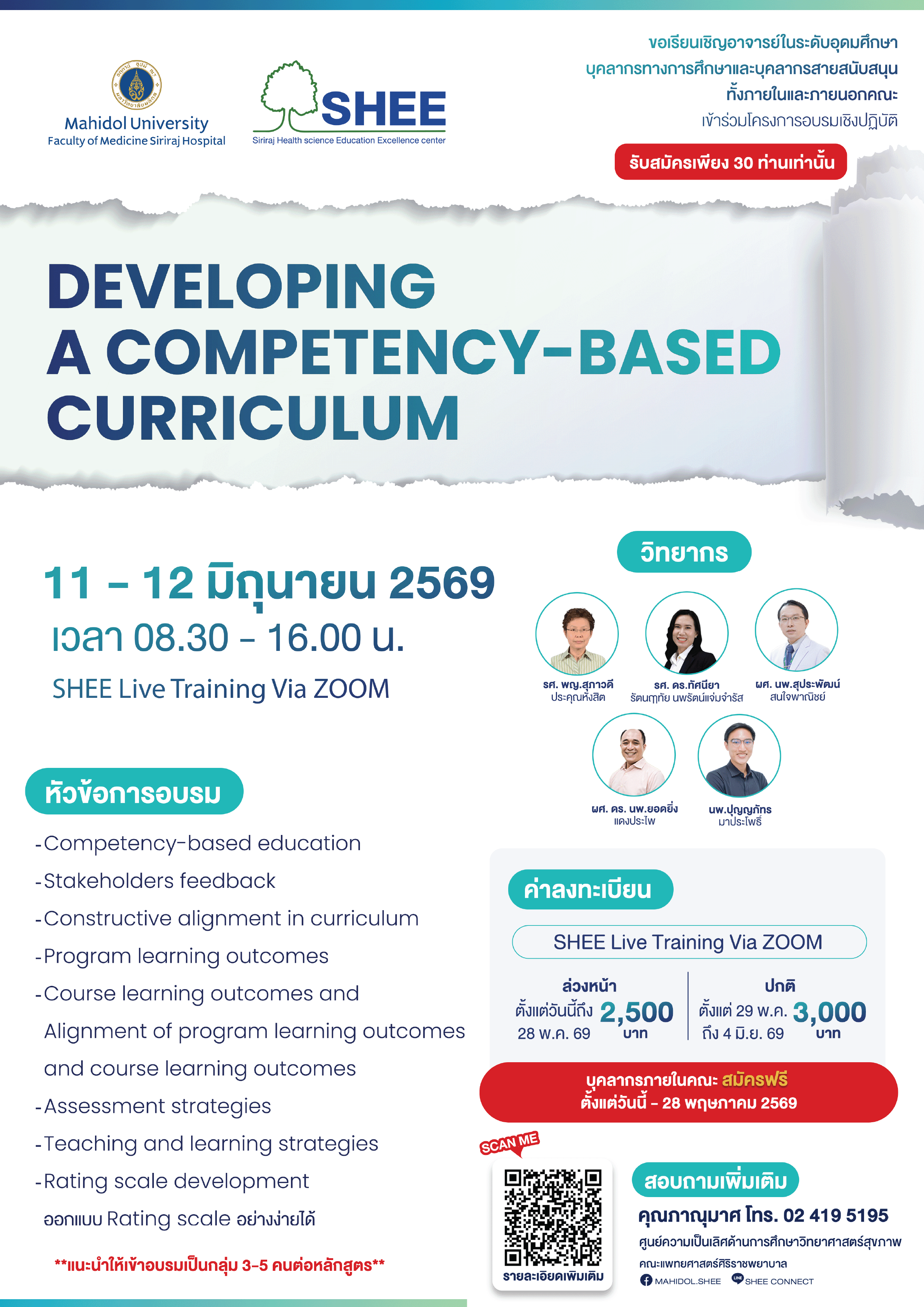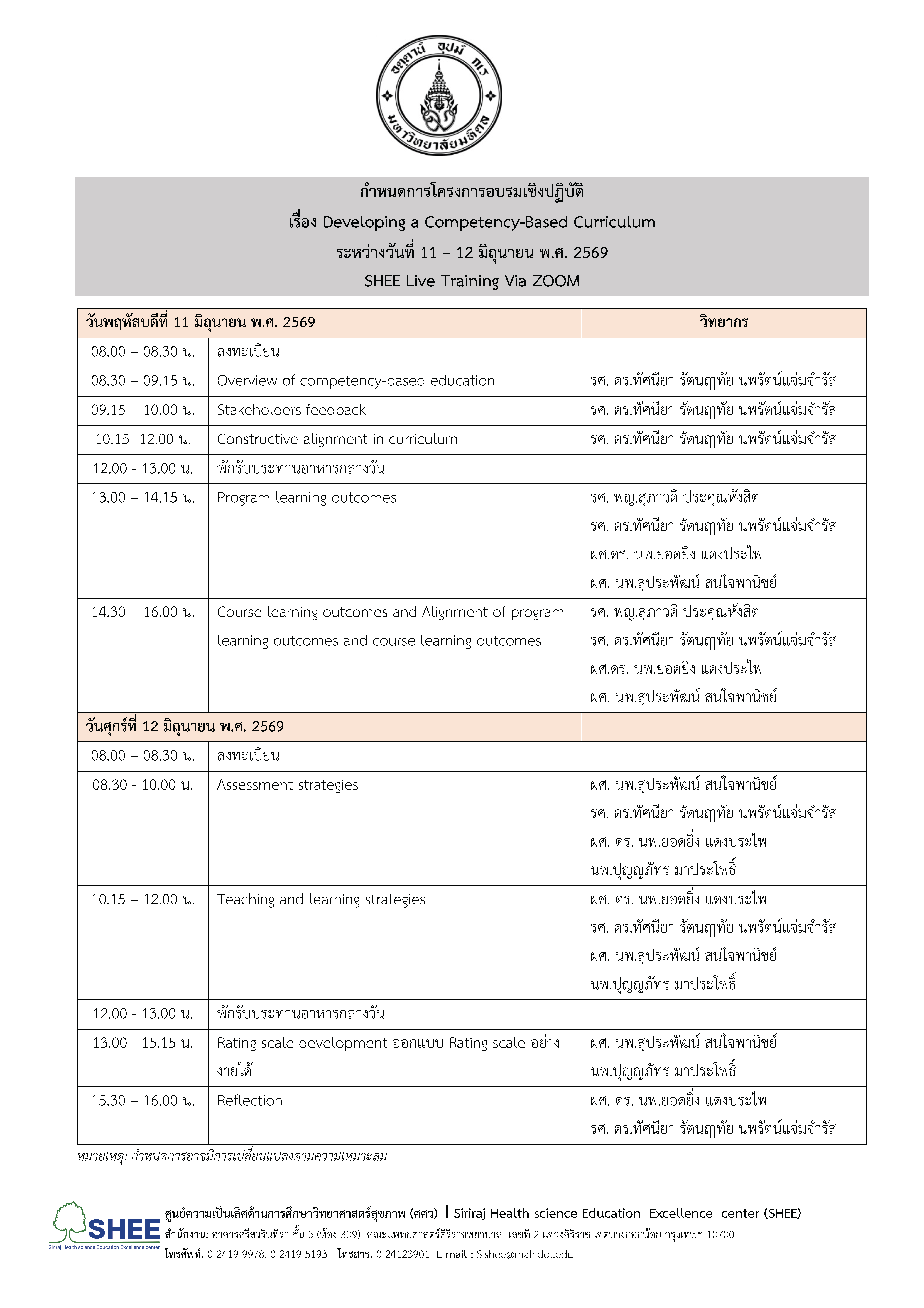 กิจกรรมบรรยายทางวิชาการ โดยวิทยากรเป็นบุคลากรภายในและบุคคลภายนอกคณะแพทยศาสตร์ศิริราชพยาบาล ใน ระหว่างวันที่ 11 – 12 มิถุนายน พ.ศ. 2569 อบรมผ่านระบบออนไลน์ ด้วยโปรแกรม ZOOM