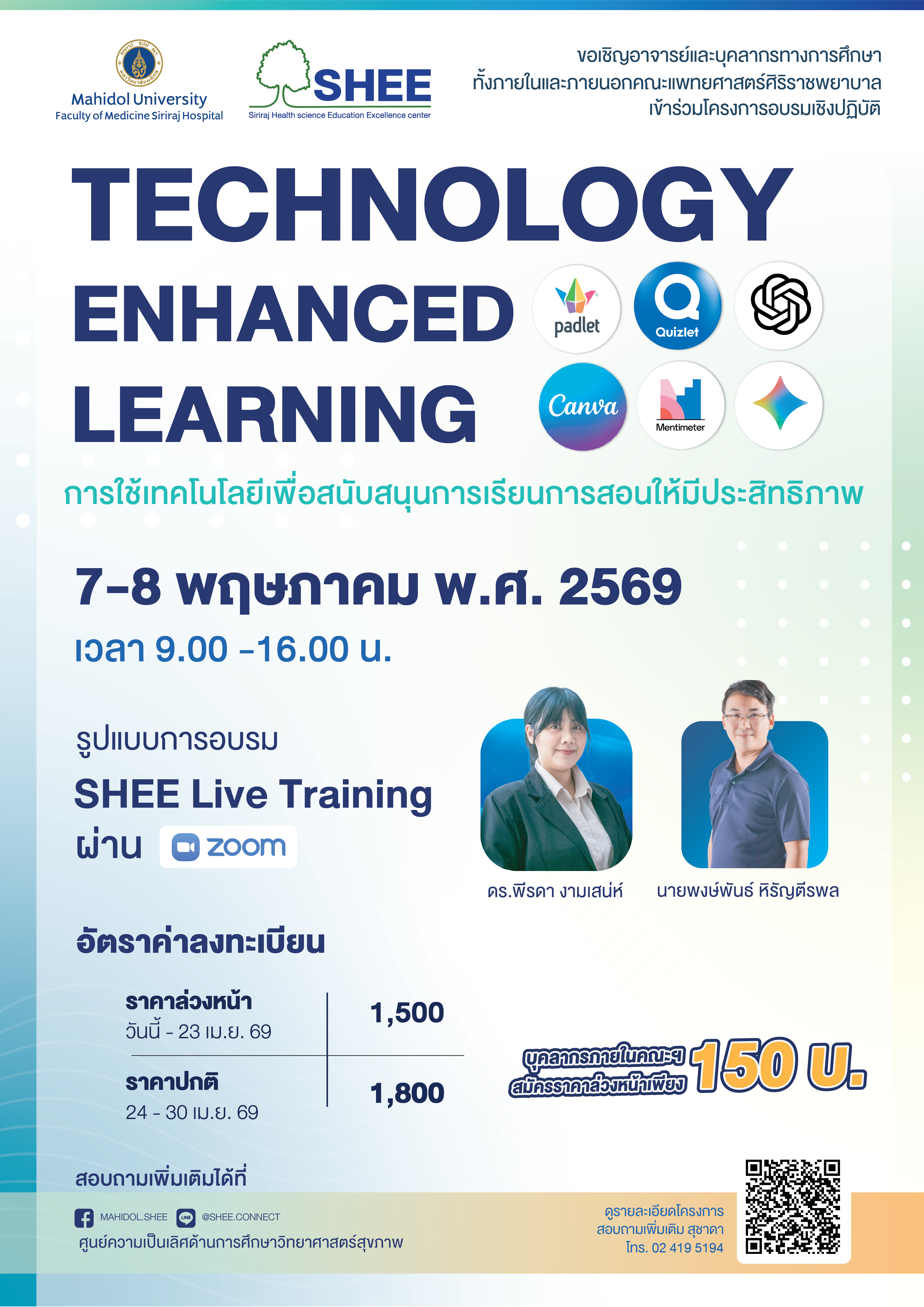 กิจกรรมบรรยายทางวิชาการและฝึกปฏิบัติ จำนวน 2 วัน โดยวิทยากรเป็นบุคลากรภายในคณะแพทยศาสตร์ศิริราชพยาบาล ในวันที่ 7-8 พฤษภาคม 2569 ผ่านระบบ SHEE Live Training via ZOOM