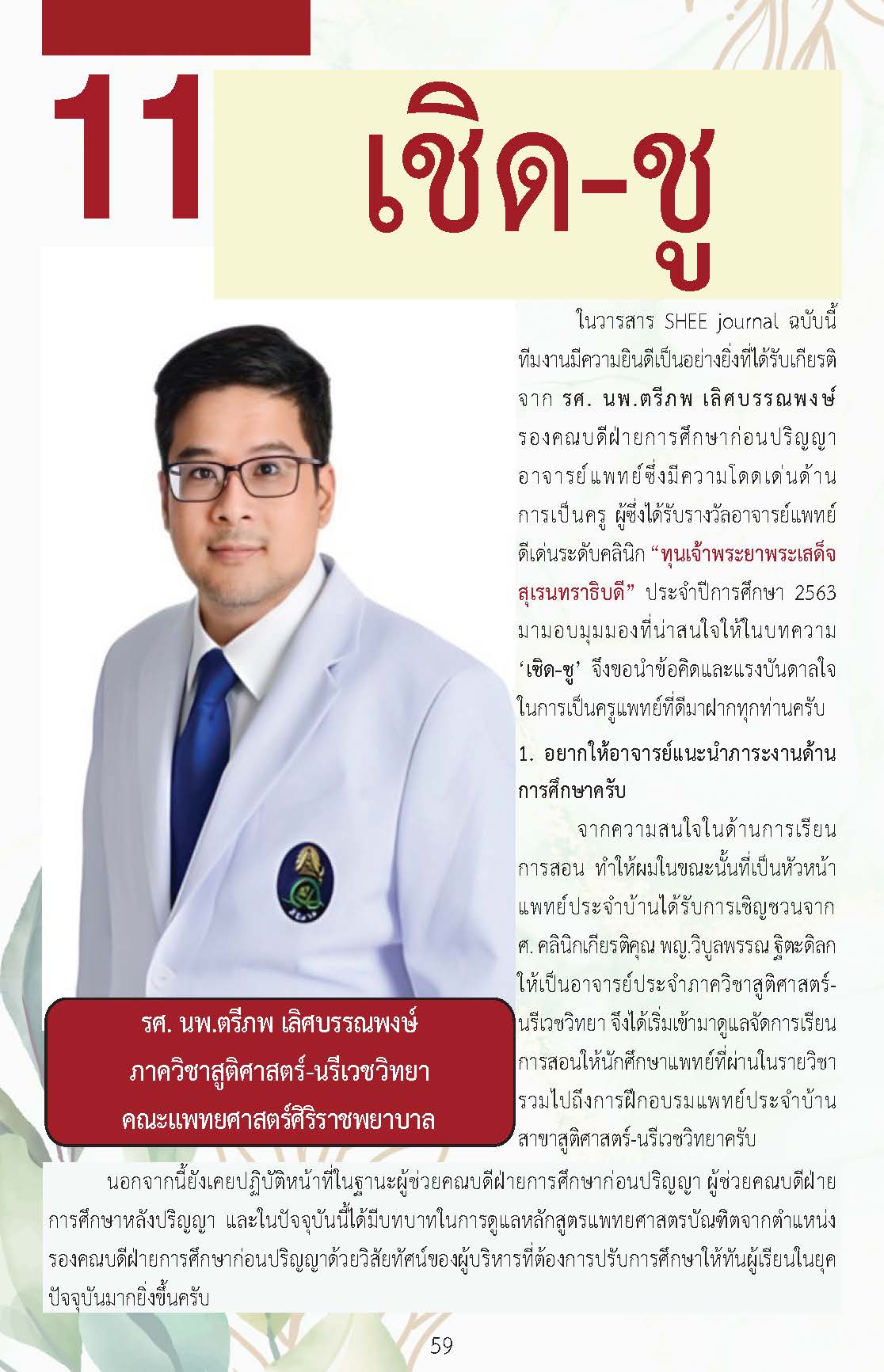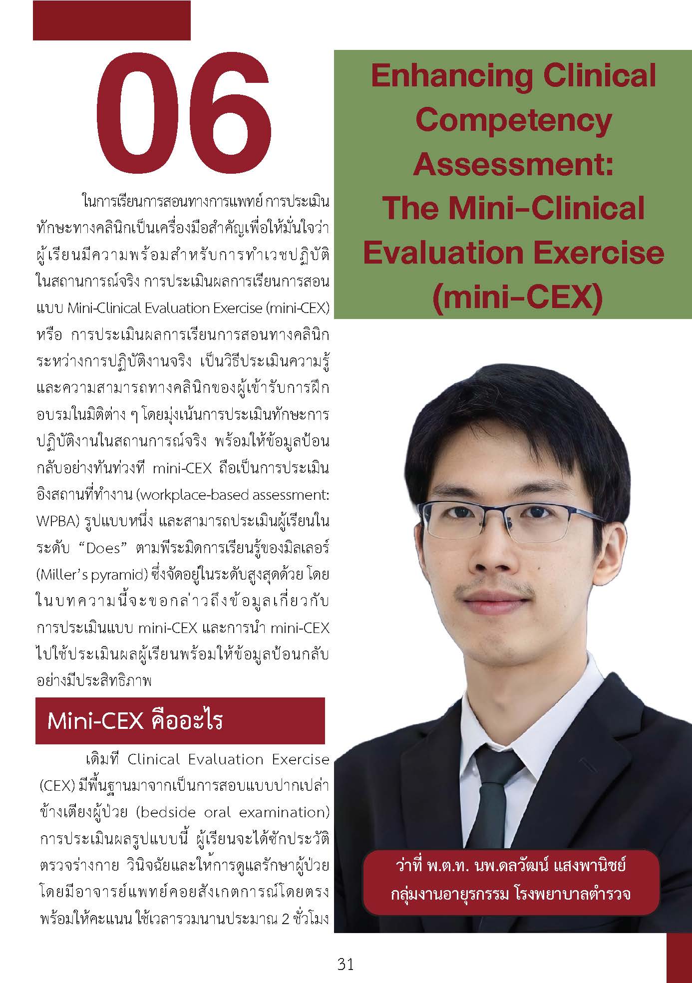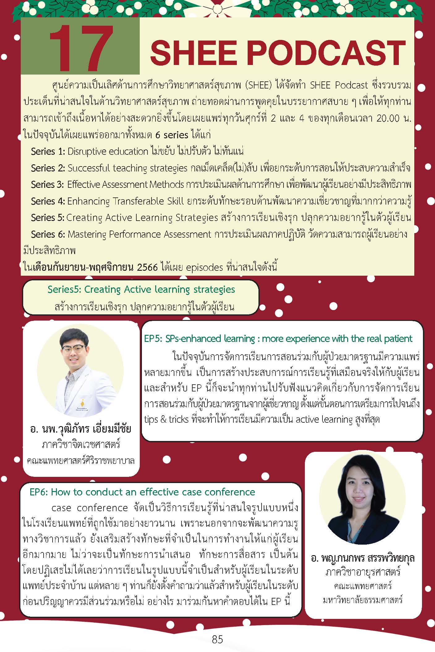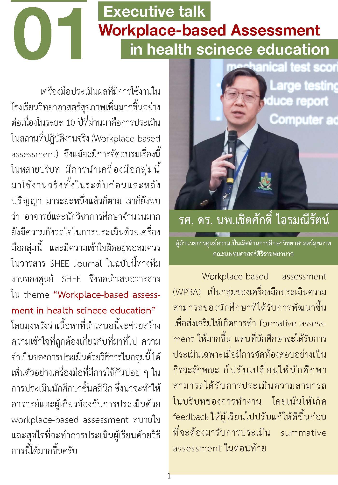 วารสาร SHEE journal ในฉบับนี้ ทางทีมงานจึงได้จัดสรรบทความมาใน theme “workpace-based assessment” โดยทางทีมงานได้พยายามรวบรวมประเด็นสำคัญในการประเมินผลด้วย workplace-based assessment ตั้งแต่ความสำคัญ​ของการประเมิน การเลือกใช้เครื่องมือ ความสัมพันธ์กับ EPAs รายละเอียดของแต่ละเครื่องมือ ไปจนกระทั่งการสนับสนุนด้วย technology เพื่อเป็นแนวทางการออกแบบระบบการใช้ workplace-based assessment ให้แก่อาจารย์ในโรงเรียนวิทยาศาสตร์สุขภาพ เนื้อหาที่นำเสนอในวารสาร มีทั้งบทความจากคณาจารย์ และแพทย์ใช้ทุนของศูนย์ความเป็นเลิศด้านการศึกษาวิทยาศาสตร์สุขภาพ คณาจารย์ในคณะแพทยศาสตร์ศิริราชพยาบาล และ คณาจารย์ผู้ทรงคุณวุฒิภายนอก เนื้อหาจึงน่าจะเป็นประโยชน์แก่ท่านผู้อ่านเป็นอย่างยิ่งไป