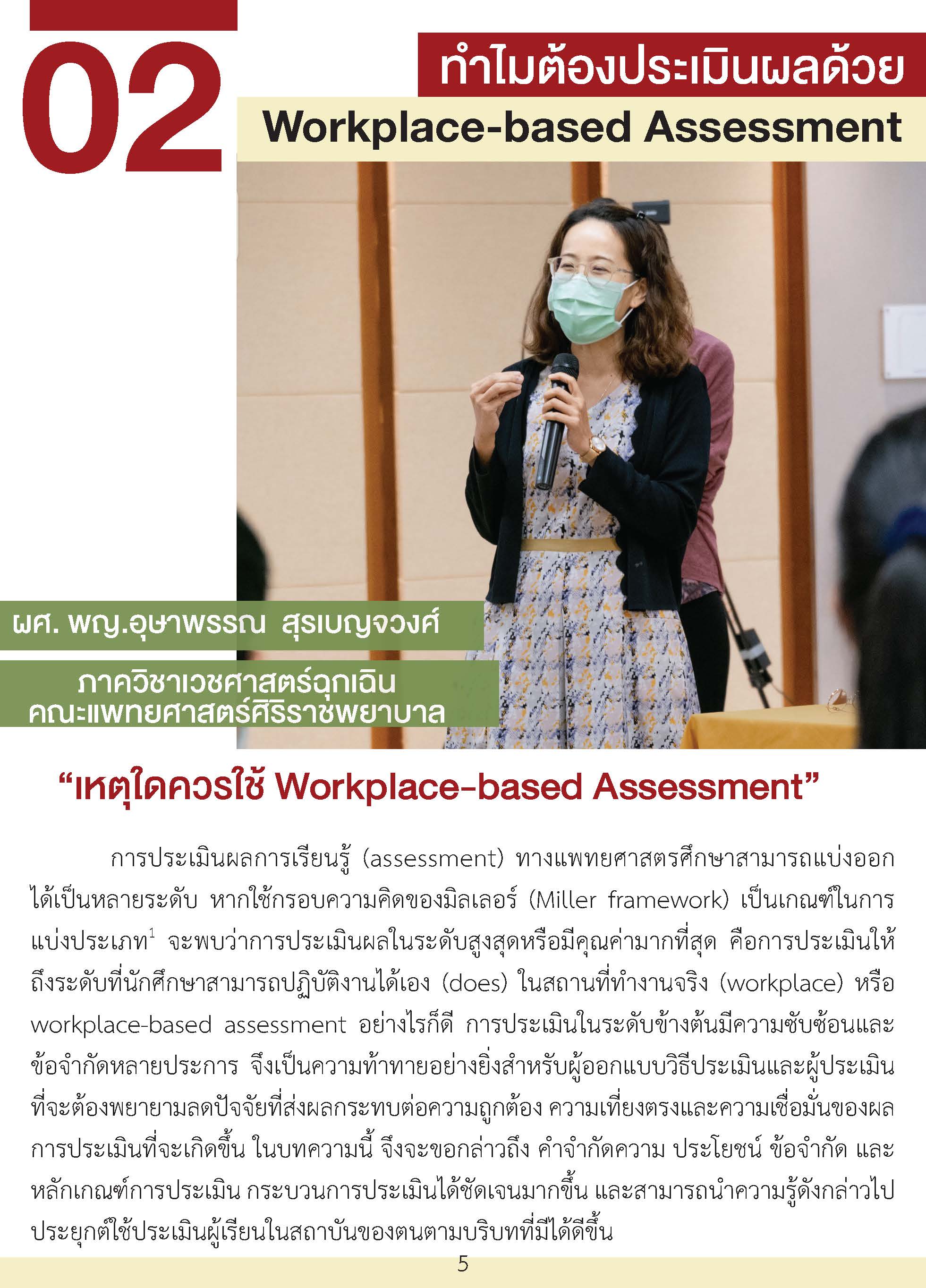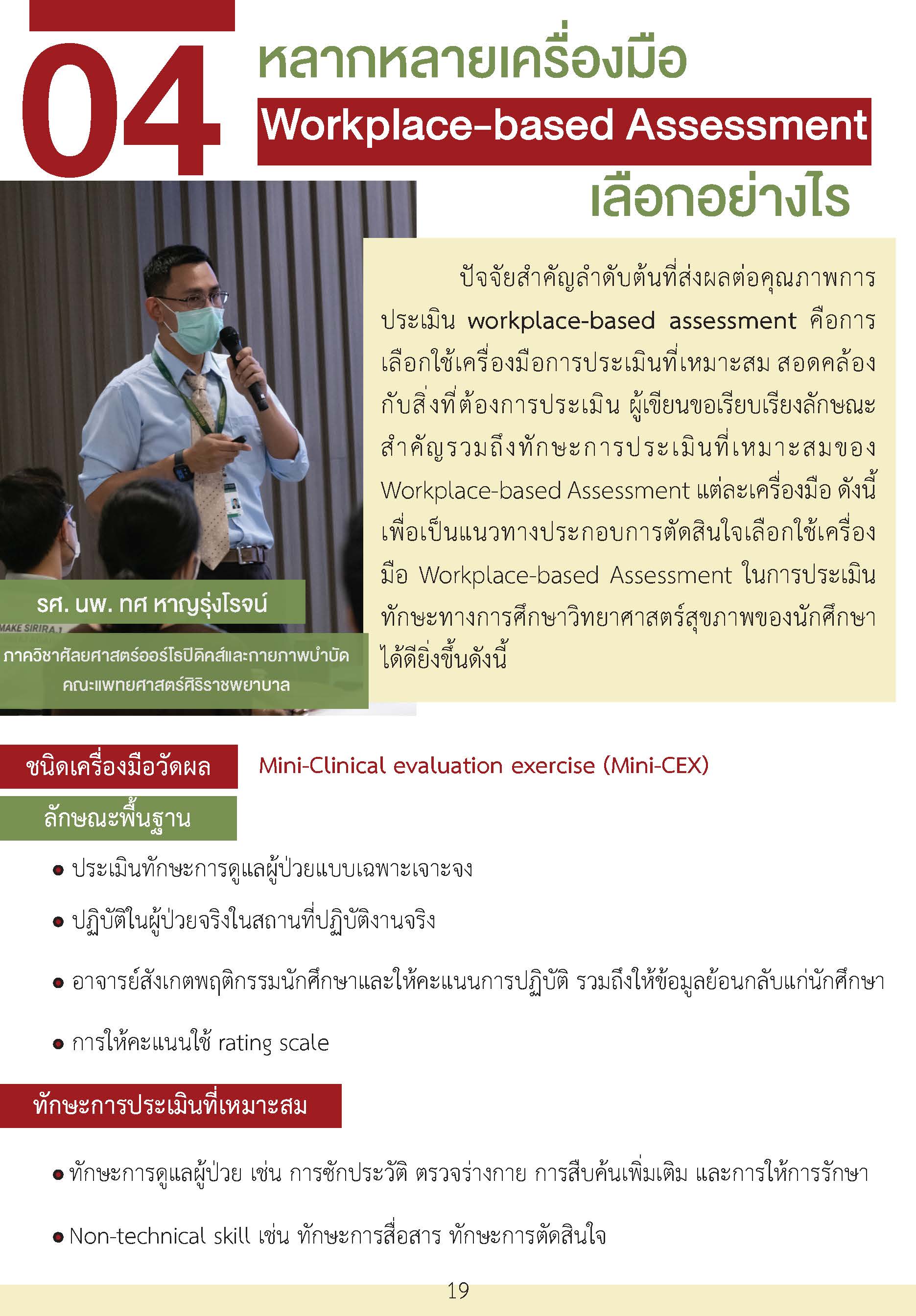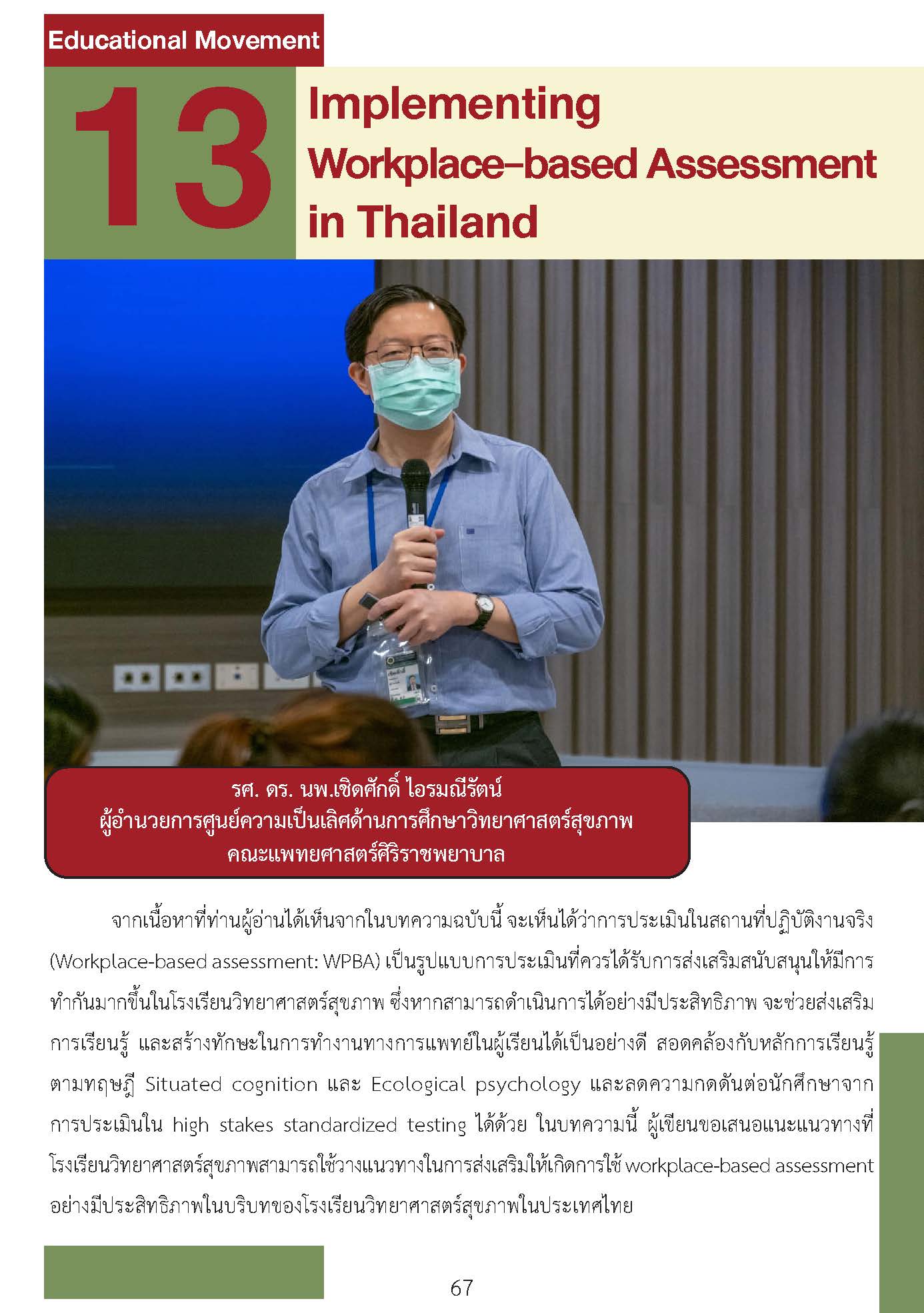 Workplace-based assessment เป็นเครื่องมือประเมินผลที่มีความสำคัญอย่างมากโดยเฉพาะนักเรียนวิทยาศาสตร์สุขภาพชั้นคลินิก ที่จะต้องพัฒนาตนเองให้สามารถดูแลผู้ป่วยได้ในสถานการณ์จริง แม้ว่าจะมีการใช้ในประเทศไทยเป็นเวลานานและในหลากหลักสูตร ในปัจจุบันยังพบปัญหาความเข้าใจที่ไม่ถูกต้องนำไปสู่ภาระที่มากเกินความจำเป็นสำหรับอาจารย์ และประโยชน์ต่อการเรียนรู้ของผู้เรียนที่ไม่ดีเท่าไหร่ หากมีความเข้าใจเครื่องมือเหล่านี้ได้ดียิ่งขึ้น เชื่อว่าจะเป็นประโยชน์ต่อหลักสูตรฝึกอบรม อาจารย์ในหลักสูตร ผู้เรียนทุกคน รวมไปถึงผู้ป่วยในอนาคตที่ผู้เรียนจะได้ดูแลรักษาต่อไป