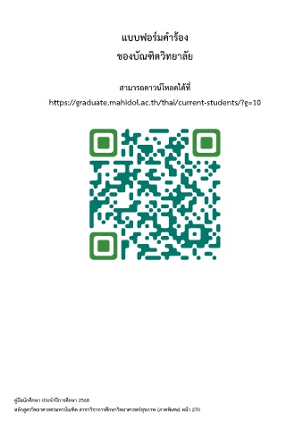 แบบฟอร์มค าร้อง ของบัณฑิตวิทยาลัย สามารถดาวน์โหลดได้ที่ https://graduate.mahidol.ac.th/thai/current-students/?g=10 คู่มือนักศึกษา ประจ าปีการศึกษา 2568 หลักสูตรวิทยาศาสตรมหาบัณฑิต สาขาวิชาการศึกษาวิทยาศาสตร์สุขภาพ (ภาคพิเศษ) หน้า 270