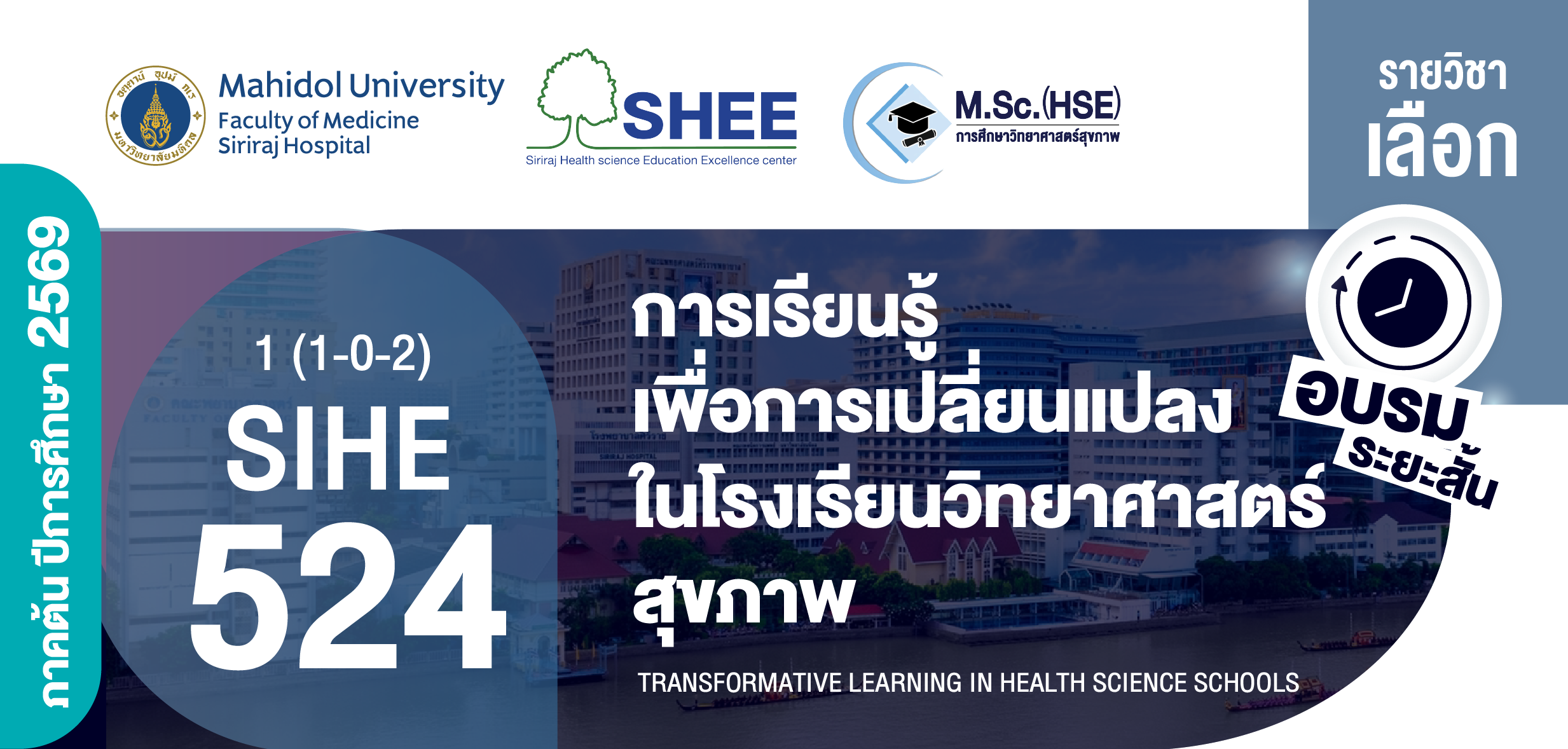รับสมัครเข้าศึกษาหลักสูตรอบรมระยะสั้น (Short Course) เรื่อง การเรียนรู้ เพื่อการเปลี่ยนแปลงในโรงเรียนวิทยาศาสตร์ สุขภาพ (SIHE 524)